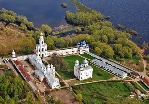 На южной окраине Великого Новгорода на берегу реки Волхов расположился Юрьевский монастырь. Это мужской монастырь Русской православной церкви в честь великомученика Георгия. Юрьевский монастырь - один из древнейших в России, в Средние века духовный центр Новгородской республики. По преданию, основан в 1030 году князем Ярославом Мудрым. Ярослав Владимирович в святом крещении носил имя Георгий; в русском языке последнее обычно имело форму «Юрий», откуда и пошло название монастыря. Первое летописное упоминание относится к 1119 году. Монастырь владел огромными земельными угодьями и осуществлял сложнейшую хозяйственную деятельность. Крестовоздвиженский собор Храм этот находится на северо-восточном углу монастыря. Он выстроен в 1823 году. Имеет 5 глав синего цвета, на которых размещены 208 восьмиконечных звёзд. После закрытия монастыря большевиками храм со временем утратил настенную роспись, и в настоящее время не имеет таковой. Внутренние стены окрашены в белый цвет. В 1921 году было при