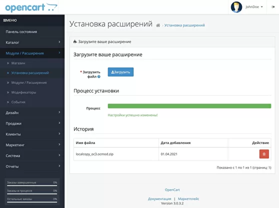 Opencart это популярная CMS, рассказываем как настроить СМС-уведомления для ваших покупателей в её рамках. Разрешите установку модуля через установку дополнений В некоторых версиях OpenCart/ocStore отсутствует возможность устанавливать файлы в папку system , поэтому скачайте и установите модуль в пункте "Установка дополнений После этого обновить Зайдите в "Модификаторы" и нажмите "Обновить" Установите модуль в разделе установка расширений Скачайте модуль для вашей версии: