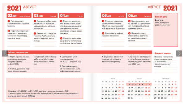 В августе вас ждет много работы с бумагами. Нужно подготовить документы по образовательной деятельности, программу воспитания, приказ о начале учебного года. И еще – по традиции провести педсовет и подготовить педагогов к учебному году. Эксперты разработали циклограмму дел заведующего на август. Мы обновили ее формат и сделали в виде планера. На каждый день по-прежнему указаны дела, а под каждым днем еще даны документы, чтобы вы знали, какие необходимо оформить для того или иного мероприятия. Узнайте подробнее на портале Ресобр.ру. Подпишитесь на канал, чтобы не пропустить новые публикации.