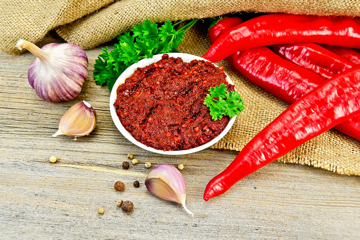 Итак, потребуется красный острый перец, соль, чеснок, хмели-сунели, уцхо-сунели, паприка, сушеная кинза, семена укропа, грецкий орех. 300 гр красного перца нужно пропустить через мясорубку, туда же отправить 100 гр чеснока, 30 гр хмели-сунели, 10 гр уцхо-сунели, сушеной кинзы, семян укропа, 60 гр грецких орехов, 1 чайную ложку соли (по вкусу). Можно добавить немного свежей зелени – например, немного базилика (регана) и кинзы, они придадут приправе сочности. Должна получиться пастообразная масса.
