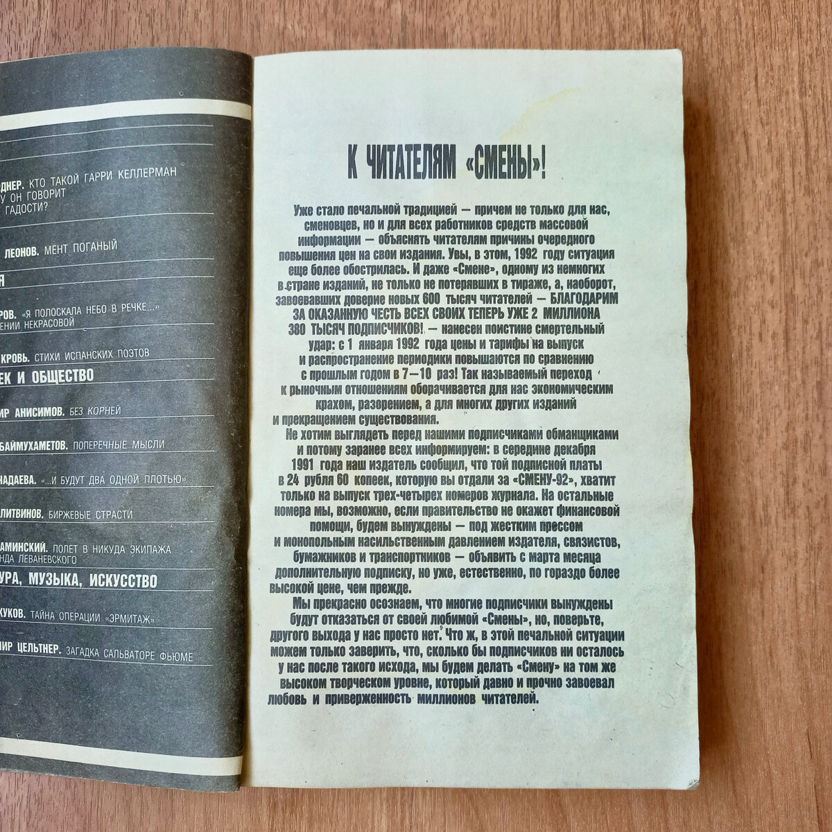 "...[Смене] нанесён поистине смертельный удар: с 1 января 1992 цены и тарифы на выпуск и распространение периодики повышаются в 7-10 раз! Так называемый переход к рыночным отношениям оборачивается для нас экономическим крахом, разорением, а для многих других изданий и прекращением существования".