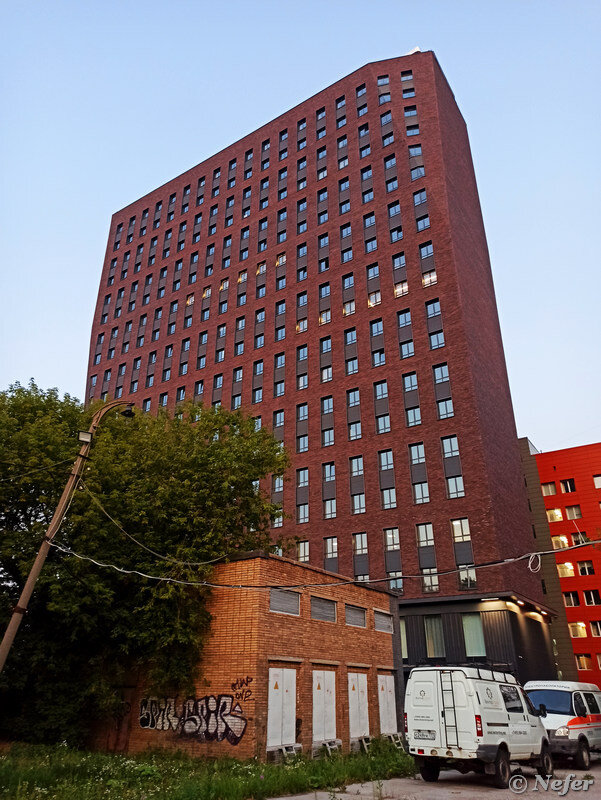 Дело было вечером. Мы возвращались с велопрогулки по району Хорошево-Мневники, уже подъезжали к станции МЦК, как вдруг я увидела на горизонте ЧТО-ТО. Объект возвышался над окружающей застройкой. Решили доехать до него, чтобы узнать, что это. Собственно вот. Стою, жду зеленого сигнала светофора и рассматриваю здание. Что бы это могло быть? Советский НИИ или старый завод? Оказалось, ни то, ни другое. Это свежепостроенный многофункциональный комплекс, 20 этажей: с 3 по 13 - офисы, с 14 по 20 - отель. Под впечатлением от дизайна и архитектуры дома, обошла его вокруг, сделала несколько фотографий. Его только-только закончили, стройка еще продолжается, территория огорожена. По соседству находится еще одно необычное здание. Оно несимметричное, неправильной формы, с выступающими округлыми частями. Около входа толпился народ, молодые парни и девушки в шортах и шлепанцах. Мне стало интересно осмотреть здание, поехала вокруг, удивилась еще больше. Из окна раздался звук аккордеона, за углом бубнил