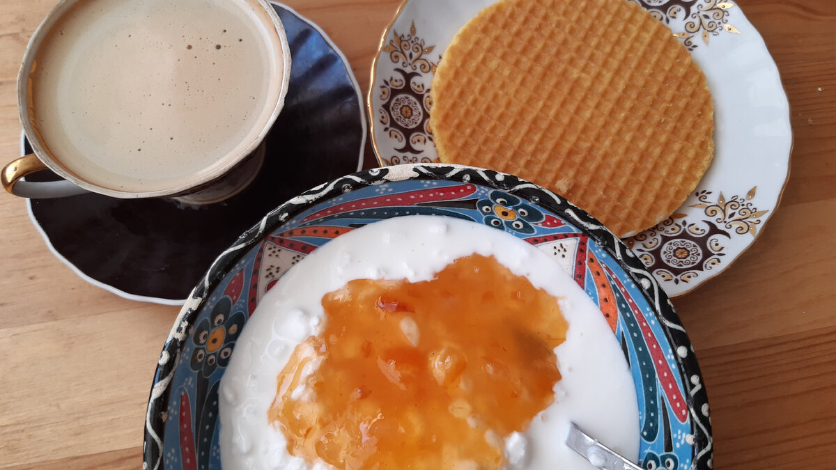 Завтракаем сегодня зерновым творогом с джемом, кофе и голландской вафлей