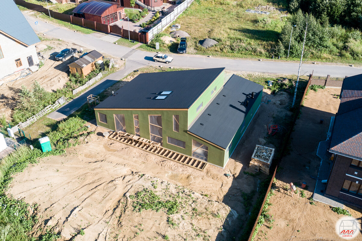 На момент съемки завершён II этап стройки – готова так называемая "коробка под крышу", то есть сделан фундамент, каркасы стен и кровля: