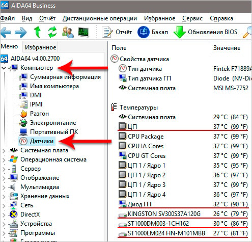 В этом уроке давайте разбираться с этим вопросом и решать, что делать если температура очень высокая. Первым делом давайте разберемся, как посмотреть текущую температуру процессора, видеокарты и жёстких дисков. Я для этих целей всегда советую программу AIDA64. Скачайте её и установите. После запуска программы нам нужно открыть раздел Компьютер, затем Датчики. Здесь нас интересуют следующие строчки: ЦП (процессор) – 37 градусов. ДИОД ГП (видеокарта) – 33 градуса И то что ниже это жесткие диски. В моём случае их 3 штуки. Температура до 30 градусов. Эта температура при простое, то есть когда мы особо ничем компьютер не нагружаем. Чтобы узнать какая температура будет при нагрузке, нужно зайти в современную игрушку и поиграть 15 минут. Потом свернуть окно игры и сразу обратить внимание на температуру в AIDA64 (программма, естественно, перед входом в игру уже должна быть запущена). А теперь давайте рассмотрим, какая температура является нормальной, а какая недопустима и требует нашего вмешат