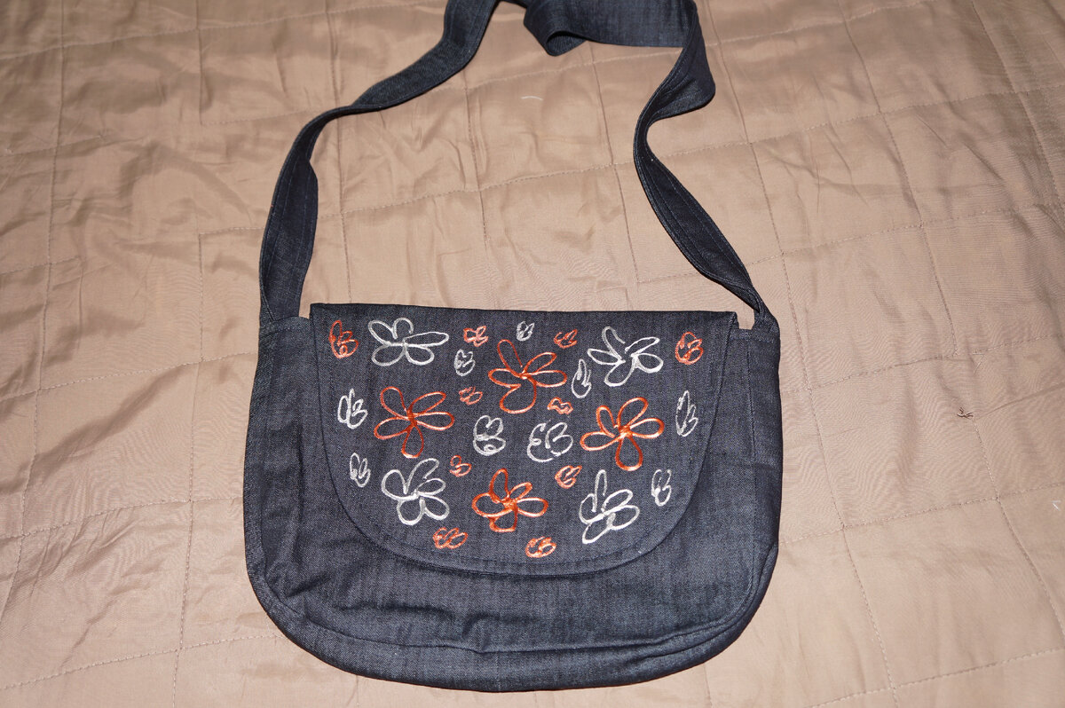 Джинсовка осталась от плаща, хотелось что-то камерное, не яркое. Застёжка магнитная кнопка. Внутри сумка проложена дополнительным слоем хлопка и синтепоном. Два кармашка для мелочей и телефона. Сзади два кармана из костюмной ткани, подходящей по цвету, для проездного. Клапан зарисовала красками по ткани, продаются в Леонардо. Можно стирать в машинке, краска не стирается, не отваливается, проверяла. Очень удобно такими красками маскировать пятна и дефекты на одежде и обуви. Кеды себе задекорировала такими красками, стали как новенькие.