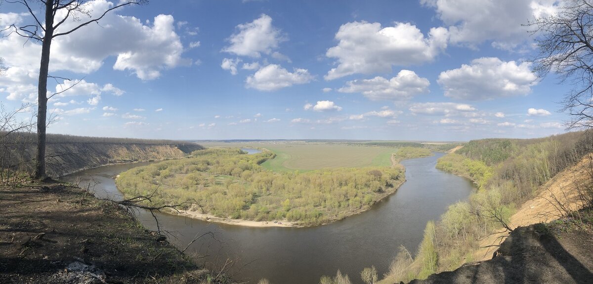 2. Здесь, на высоком берегу Дона, лесистый обрыв над излучиной реки создаёт естественную смотровую площадку на поля противоположного низкого берега. Вид красивый, особенно когда это первое, что видишь в путешествии: