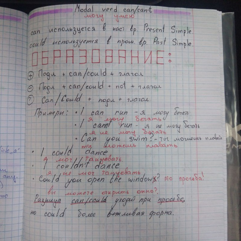 дословно can переводится могу умею can используется в настоящем времени Present Simple could используется в прошедшем времени Past Simple Образование: Утвердительное предложение: Подлежащие + can/could + глагол I can run - я могу бегать I could dance - я мог танцевать Отрицательное предложение: Подлежащие + can/could + not + глагол I can`t run - я не могу бегать I couldn`t dance - я не мог танцевать Вопросительное предложение: can/could + подл + глагол Can you run? - ты можешь бежать? Could you dance? - ты можешь танцевать? Просьба: разница между can/could при просьбе исчезает, но could более вежливая форма. Строиться как вопрос Could you open the window? - можешь ли ты открыть окно? На этом всё