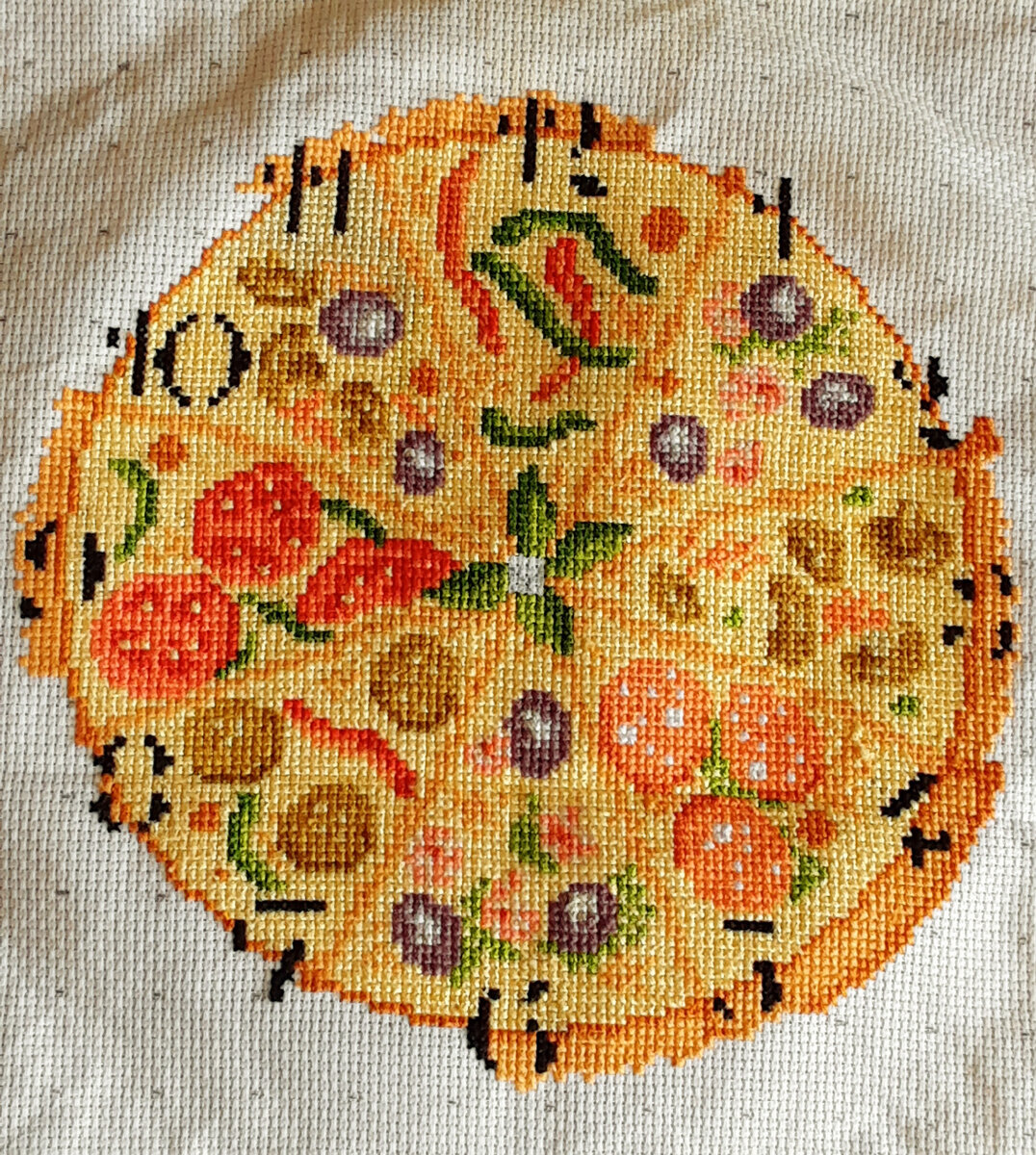 Всем привет, дорогие читатели! Как ни странно, но мне не хватило ниток для вышивки фона теста... Я не очень беспокоилась по этому поводу, думала, что у меня в запасе в пакетике есть ещё, однако нет, те нитки, которые лежали в рабочей шкатулке, были единственными. В дольке с цифрами 10 и 11 закончились нитки, и я начала думать, чем довышить оставшийся, совсем небольшой, участок теста. Стала сравнивать оттенки и обратила внимание, что нитки для вышивки оливок по цвету почти совпадают с нитками теста. Поискала в запасах подобные золотистые оттенки, нашла похожий в наборе со Змеем Горынычем. Вышила немного и все-таки обнаружила, что нитки для оливок и для Змея-Горыныча совпадают, поэтому решила продолжить работу с нитками для оливок. Конечно, они немного более блестящие, чем нитки для фона-теста, но ничего, будет один кусочек пиццы более румяный:)). Когда я закончила вышивать тесто у дольки с цифрами 11 и 10, то обнаружила, что оттенки хоть и не сильно отличаются, будучи на бобинке