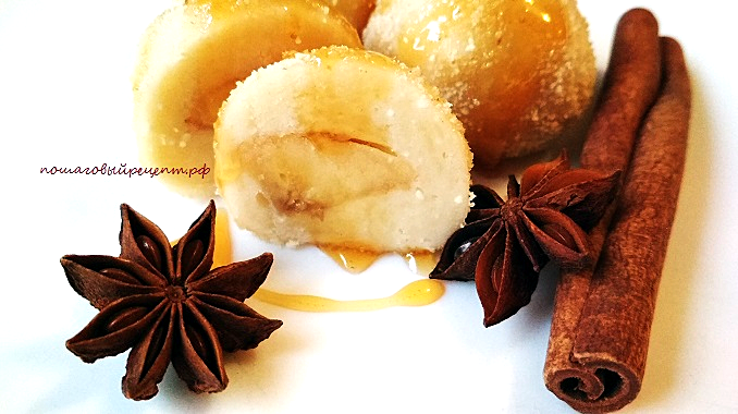 Творожные шарики без жарки Сегодня будем готовить очень вкусное блюдо, которое прекрасно подойдет для завтрака всей семьей. Это будут творожные шарики с банановой начинкой. Подавать их мы будем с медом, при этом блюдо готовятся они без масла и жарки, что очень полезно. Еще они могут использоваться в качестве начинки в торт. Для приготовления нам понадобятся самые обычные продукты: Ингредиенты Способ приготовления После раскатываем тесто в колбаску и делим на равные части. Всего у меня получилось 25 штук. Банан почистить и нарезать небольшими кусочками. В центр каждого шарика положить банан, придать круглую форму. Теперь нам осталось их отварить. Для этого помещаем шарики в кипящую подсоленную воду, и после того, как они всплывают-варим около 1 минуты. Готовые шарики сразу обваливаем в панировочных сухарях, смешанных пополам с сахарной пудрой. Подаем с медом. Хотели бы приготовить такое блюдо, поделитесь в комментариях!