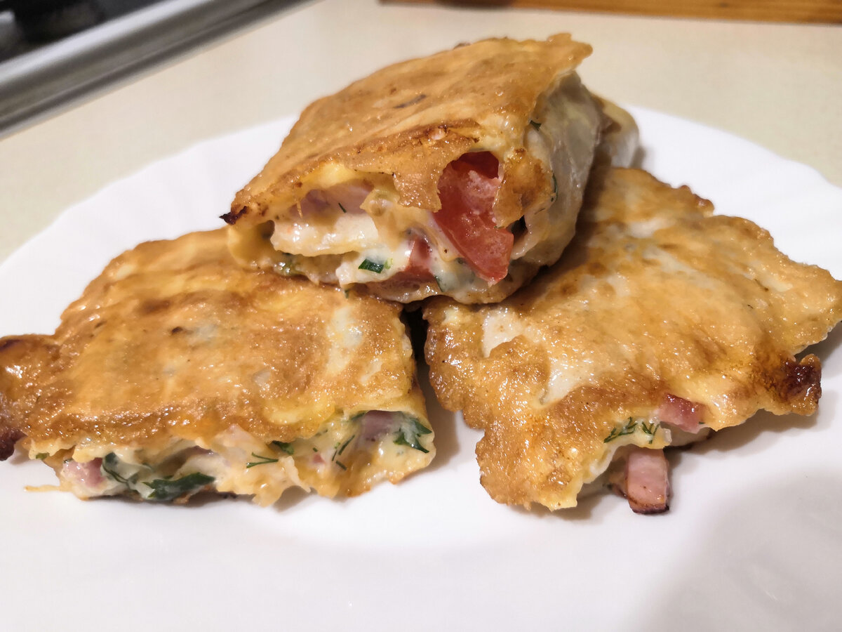 Интересный вариант завтрака из лаваша и начинки из помидор и ветчины