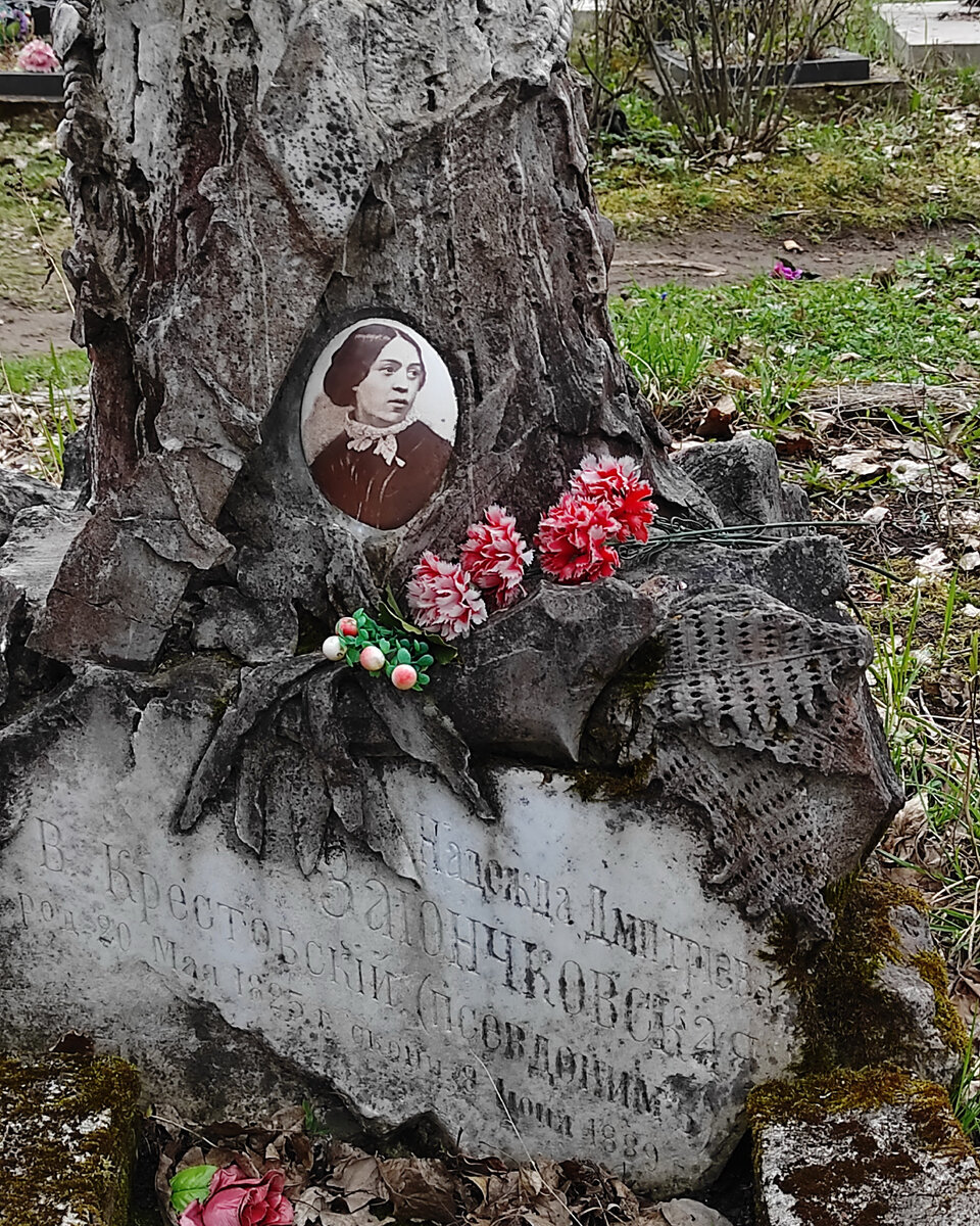 На памятнике написано: Надежда Дмитриевна Зайончковская. В.Крестовский (псевдоним). Родилась 20 мая 1825 г, скончалась 8 июня 1889 г.