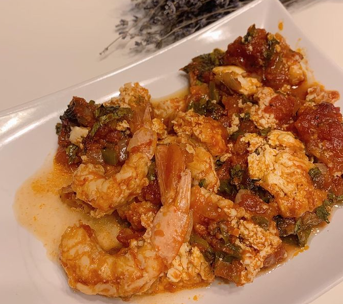 Креветки очистить, положить в огнестойкую посуду и залить соусом.