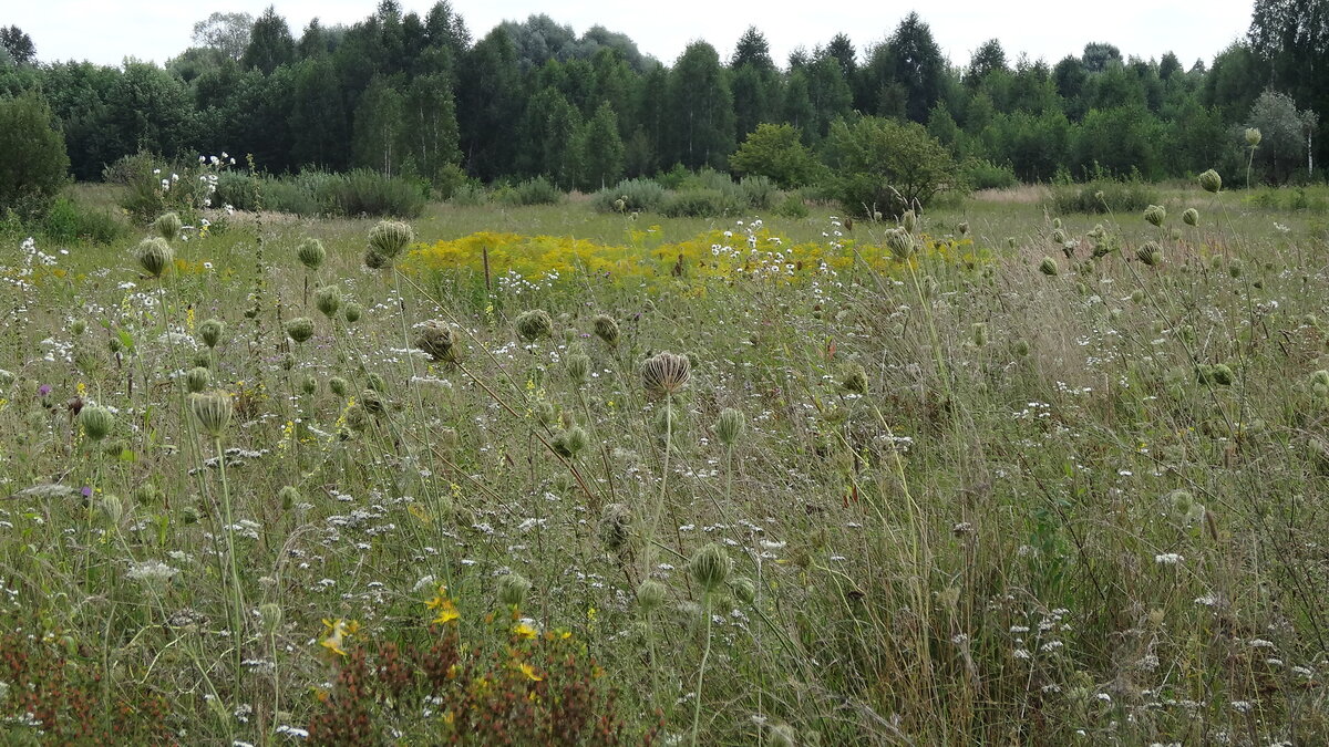 Незаметно пролетела почти половина августа. Миновала пора тёплых ночей, когда термометр ещё долго после захода солнца упрямо показывал 22-23 градуса по Цельсию. Надо сказать, эти удивительно ласковые ночи задержались в наших краях намного дольше обычного. Наверное, это компенсация затяжных холодов в мае и июне. И тем не менее, приближение осени становится всё заметнее: чем ближе солнышко опускается к горизонту, тем стремительнее холодает, а туманным утром температура уже 12-14 градусов. Зато днём погода стоит по большей части приятная: солнышко, то и дело прячущееся за облаками, ещё вполне прилично прогревает воздух, а заметно усилившиеся ветры не дают зною разгуляться. Вчера был как раз такой денёк, и я снова шла с работы пешочком через поле на свою пока ещё дачу. Покажу, как изменился пейзаж за две недели, прошедших после моей июльской прогулки. Белые зонтики, покрывавшие всё вокруг, постепенно отцветают. На смену им приходит разрастающаяся островками амброзия. Довольно часто ещё мож