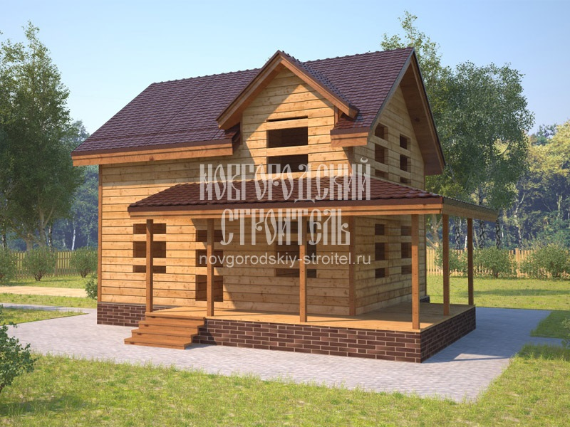 Большой деревянный дом - отличный вариант загородного жилья. В зависимости от выбранной толщины стены, он может служить дачей или местом для постоянного проживания. Однако необходимость сразу вложить большую сумму в строительство и отделку отпугивает ценителей экологически чистых построек. Решить вопрос позволяет возведение сруба "под усадку". В этом случае первичные траты на "коробку" под крышу относительно невелики, а вторая половина суммы - на устройство коммуникаций, отделку - потребуется не ранее чем через 6...8 месяцев, после завершения усадки. Предложенный компаний "Новгородский строитель" проект представляет собой достаточно большое здание с Г-образной террасой-галереей. При желании эта терраса может быть сразу же подготовлена для остекления, что позволяет заметно расширить полезную площадь дома. Планировка рассчитана на семейный быт и устройство отопления на базе твердотопливного или комбинированного котла (либо газового котла достаточно большой мощности). Под технические нужд