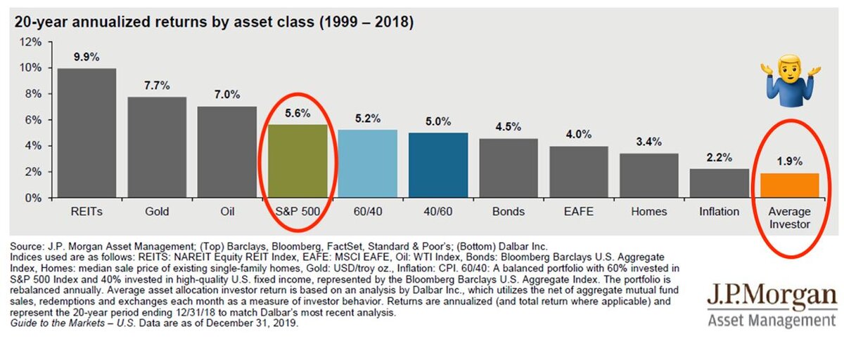 1. Доходность среднего инвестора На 15-летнем горизонте 95% профессиональных управляющих не могут обогнать по доходности индекс S&P500. Получится ли у нас? Большинство начинающих частных инвесторов думают, что да. Продолжаю надеяться и я. Столбцы на картинке показывают среднегодовую доходность разных классов активов за последние 20 лет. Статистически средний инвестор сильно проигрывает индексу. Чтобы преуспеть в инвестировании, достаточно показывать средние результаты, то есть расти вместе с ростом рынка. Логика (и Уоррен Баффет) говорит покупать только S&P500 (FXUS, VOO), но инвестору так хочется быть причастным к тем или иным бизнесам, что он не может не покупать акции. Множество разных акций. Что остается? Фондовый рынок — это инструмент по переводу денег нетерпеливых людей терпеливым людям. (Уоррен Баффет) Заигрывания с облигациями тоже не помогут заработать больше, чем даст рынок. Обе популярные схемы с соотношением акций к облигациям 60:40 и 40:60 на большом горизонте проигрывают