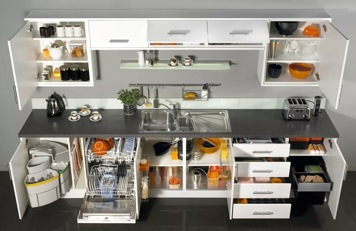 1. Обустройте основное место хранения в рабочей зоне. Организация пространства рабочей зоны кухни начинается с замеров помещения, планирования рабочего треугольника и формирования системы хранения. Предметы, используемые во время готовки, нужно держать максимально близко к варочной поверхности. Важное уточнение: не расставляйте кухонную утварь на столешнице, ее поверхность должна быть свободной, чтобы ничто не мешало работе. Массивные вещи сложите в нижней части шкафа, а лёгкие и некрупные – в верхней. 2. Рассортируйте и храните вещи/продукты по категориям. При организации пространства в шкафах на кухне применяйте сортировку по категориям. Сложите: кастрюли с кастрюлями, тарелки с тарелками. Так будет проще отыскать нужную вещь, не теряя на это времени. Хранение кухонных атрибутов по категориям не только очень удобно, но и выглядит более аккуратно. Это может показаться незначительным, но подумайте, не держите ли вы кастрюли вместе с формочками для печенья, а чай в шкафу с растительным