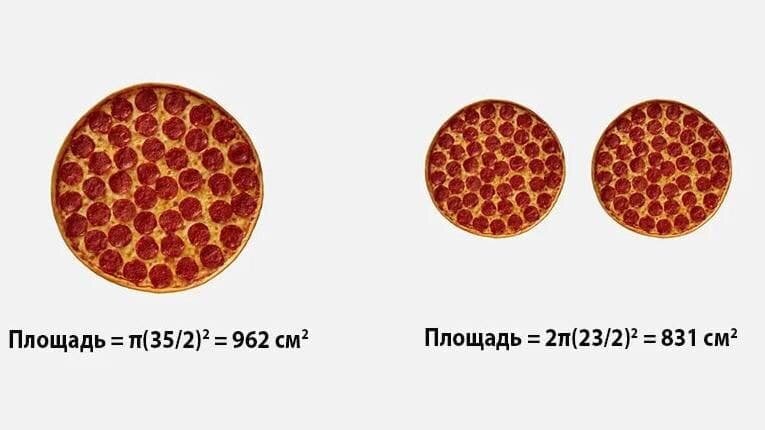 Пицца 35 см больше, чем две пиццы по 23 см. В индустрии пиццы это десятилетиями хранили в тайне. Но теперь правда произнесена вслух: сытнее на двоих брать одну 35-сантиметровую пиццу, чем две 23-сантиметровые. Покровы сорвали с помощью формулы вычисления площади круга. Математика — бесстрастна и оперирует сухими цифрами. Но мы-то знаем, что некоторый недостаток площадей можно нивелировать вкусовым разнообразием. И именно в этом случае две пиццы оказываются пусть и не больше, но вкуснее одной.