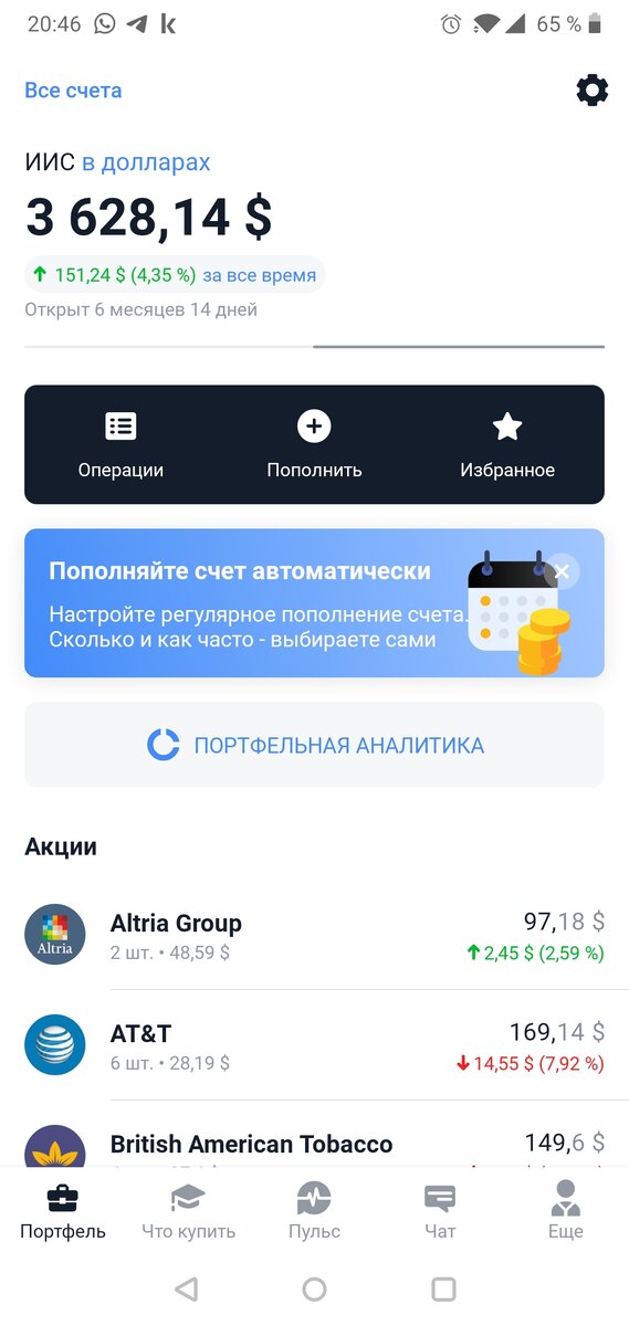 Добрый вечер, уважаемые читатели моего канала. Сорри за долгое молчание. Был в отпуске, но акции приобретать не прекратил. Что произошло с ИИС: Пришли дивиденды: AT&T - US $ 2,81. Philip Morris - US $ 1,19. Что произошло с Брокерским счетом: приобрел: Ares Capital Corp - 5 акций. К 13 сентября должно быть 47 акций, осталось приобрести 4. Williams Corp - 2 акции; Energy Transfer - 2 акции; Пришли дивиденды AT&T - US $ 1,4. ИИС: Брокерский счет: В августе див отсечки у акций из моего портфеля: Chevron; Macerich. В сентябре див отсечки у акций из моего портфеля: British American Tobacco; Coca-Cola; Iron Mountain; Williams Companies. Планы: приобрести: Ares Capital Corp, British American Tobacco и Williams Companies. Всем хорошего дня и выходных! Здоровья Вам и Вашим близким.