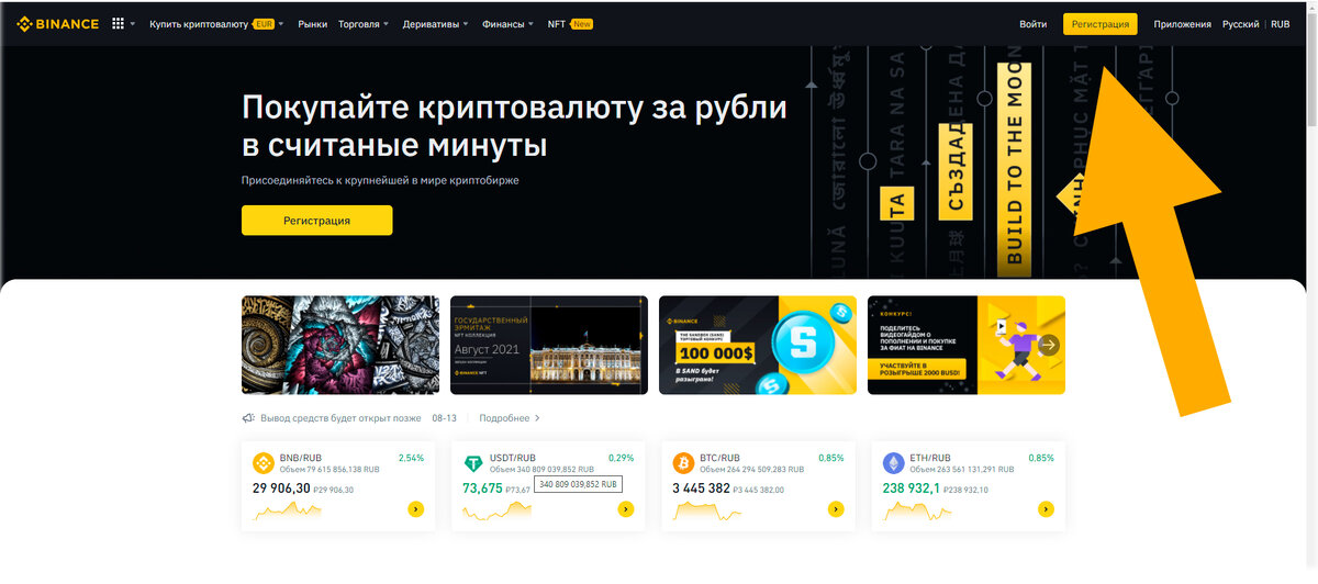 Привет! Мой выбор упал на биржу Binance. Для начало торговли переходим на сайт https://www.binance.com/ru и выбираем в правом верхнем углу регистрация. Попадаем в окно регистрации. Заполняем данные. Если хочешь получить CASHBACK в размере 10 % комиссии сервиса то в окошке Реферальный ID введи G7C7SNUG. Прямая ссылка на окно. После прохождения регистрации советую сразу пройти подтверждение личности чтобы не было проблем с выводом средств. Для начало торговли нужно пополнить кошелек. В левом верхнем углу выбираем купить криптовалюту и выбираем способ. После того как пополнили кошелек. Переходим в раздел Рынки выбираем интересующую нас пару и приступаем к торговле. Спасибо за ваше внимаем!