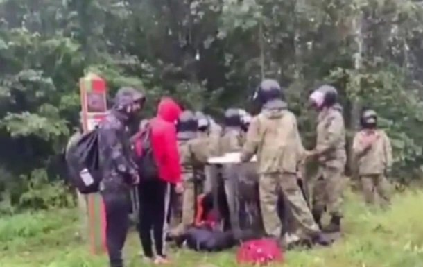 На первом видео запечатлено, как за спиной у сидящих на рельсах людей стоят трое военных с автоматами. На другом видео трое силовиков со щитами стоят возле группы из десяти человек. На третьем — целый строй силовиков в экипировке, похожей на омоновскую, а перед ними сидит большая группа мигрантов.