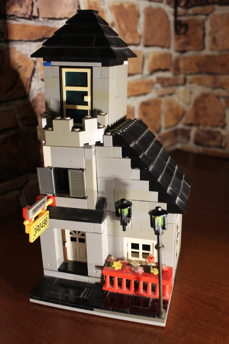 В детстве я просто обожал собирать конструктор "Лего". У меня было очень много деталей, и сегодня я нашел то, что считаю вершиной своего мастерства Легостроения. Знакомьтесь, это особняк, выполненный в стиле неоклассицизма. На этот стиль указывает дизайн светильников, вывески, заборчик балкона на третьем этаже и колонны у входной двери. Главная фишка Эта постройка обладает одной особенностью. Причины, по которой я считаю это лучшим, что я собирал: Дом внутри Открывается лицевая стена, и перед вами предстает вот такая картина: На втором этаже расположен компьютер а также сундук в мансардной части комнаты. Рассмотрим первый этаж поближе. Кафельный пол, дверь, ведущая в сад, письменный стол, не дочитанная газета на нем, баночка с неизвестным содержимым и книжный шкаф в углу. В целом, комната оформлена довольно симпатично. Уличная сторона Тротуар, фонарь, клумба и вывеска - все это присутствует перед домом. На дорожке есть даже водосток, который отлично вписался в общую картину. Эта по