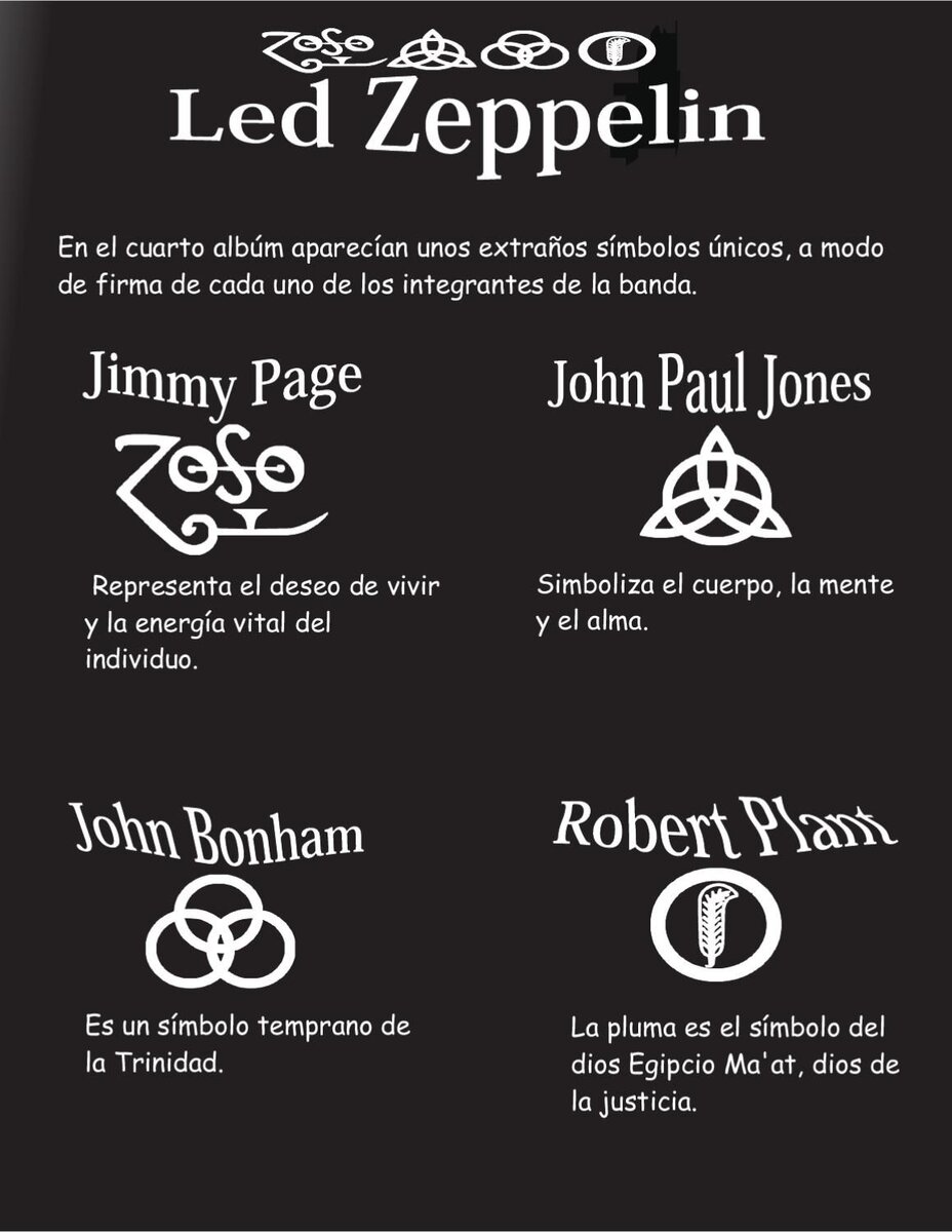 Всем доброго дня! В сегодняшней статье речь пойдет о символах и эмблемах рок-групп. По этим атрибутам можно узнать любимую команду без слов. Led Zeppelin Символы музыкантов культовой группы Led Zeppelin вызывают споры до сих пор. Всю символики музыканты придумали сами. Символ Планта Символ растения (кружок вокруг пера) изображает перо Маат - это египетская богиня справедливости. Это также эмблема писателя. Плант говорит, что созданный им символ был заимствован из священных символов древней цивилизации Му, фантастического места, которое предположительно существовало до 14 000 лет назад. Говорят, что последними остатками являются примитивные статуи на острове Пасхи. Символ Пейджа Пейдж разработал свой собственный символ (Zoso ). Хотя он напоминает алхимический символ Сатурна, его значение остается загадкой. Самая последняя теория заключается в том, что она символизирует предсмертный или тантрический сексуальный опыт, объединяющий мир живых и мертвых и, таким образом, раскрывающий тайны