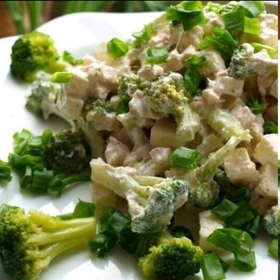 (106 ккал/100 гр) ИНГРЕДИЕНТЫ: Брокколи (замороженная) — 300 г Грудка куриная (отварная) — 1 шт Брынза — 150 г Лук зеленый (для украшения) Сметана (для соуса) — 100 г Соевый соус (для соуса) — 1-2 ч. л. Горчицa (русская, для соуса) — 0.5-1 ч. л. Смесь перцев (по вкусу) ПРИГОТОВЛЕНИЕ: — Брокколи отварить в подсоленной воде в течение 4-5 минут, выложить на тарелку и остудить. — Брокколи разделить на соцветия, добавить нарезанную курицу и брынзу. Перемешать. — Приготовим соус: к сметане добавляем половину или целую чайную ложечку горчицы, 1-2 ч.л. соевого соуса, ориентируемся на свой вкус, добавляем смесь перцев. Перемешиваем до однородной массы. — Соусом заправляем салат.
