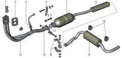 Рис. 4.16. Система выпуска отработавших газов: 1 – стопорная пластина; 2 – прокладка приемной трубы; 3 – датчик концентрации кислорода; 4 – кронштейн; 5 – болт; 6 – коническая пружина; 7 – нейтрализатор; 8 – дополнительный глушитель; 9 – основной глушитель; 10 – хомут крепления труб; 11 – тороидальное кольцо; 12 – скоба крепления приемной трубы; 13 – приемная труба; 14 – подушки подвески основного глушителя