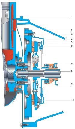 Рис. 5.1. Сцепление в сборе: 1 – картер сцепления; 2 – маховик; 3 – болт крепления кожуха сцепления к маховику; 4 – ведомый диск; 5 – нажимной диск; 6 – кожух сцепления; 7 – муфта выключения сцепления; 8 – первичный вал коробки передач; 9 – вилка выключения сцепления; 10 – центральная нажимная пружина