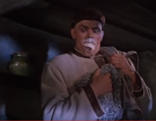 Тут заметил Вакула, что ни галушек, ни кадушки перед ним не было; но вместо того на полу стояли две деревянные миски: одна была наполнена варениками, другая сметаною. Мысли его и глаза невольно устремились на эти кушанья. «Посмотрим, — говорил он сам себе, — как будет есть Пацюк вареники. Наклоняться он, верно, не захочет, чтобы хлебать, как галушки, да и нельзя: нужно вареник сперва обмакнуть в сметану».