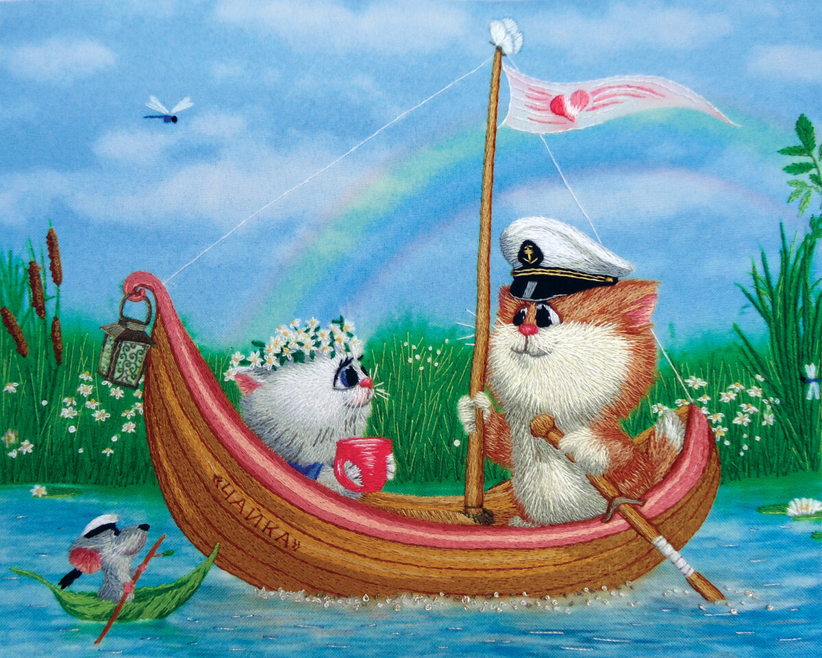 Кто-то любит котиков, кто-то собак, я, как вы наверное заметили, люблю и тех, и других, у меня были и собаки, и коты. Но больше всего я люблю вышивать, особенно гладью, а раньше вышивала крестиком и лентами. Тема заявлена - Котики в вышивке, покажу вам несколько дизайнов на эту тему, сказочных и реалистичных. Начнем вот с такого дизайна "В лодочке", мне в нем очень нравится мышонок, плывущий в лодочке из зеленого листика! А здесь продолжение сюжета - "Чай вдвоем", сидят, наверное вспоминают как плавали, а на стене висит картина, повторяющая эту прогулку. А эта сценка мне больше всех нравится! Такая атмосфера счастья и безмятежности! Вокруг нашего котика целых 12 мышей и все заняты своими делами, один книжку листает, другой катается на велике, а еще есть и шахматисты! Но то были сказки, а дальше вполне реалистичные сюжеты. Один котик, уснул на книжной полке. Другой очень любопытный, тянется к нотам и скрипке. А этот - охотник, притаился, наблюдает за голубем. Все эти дизайны были разраб