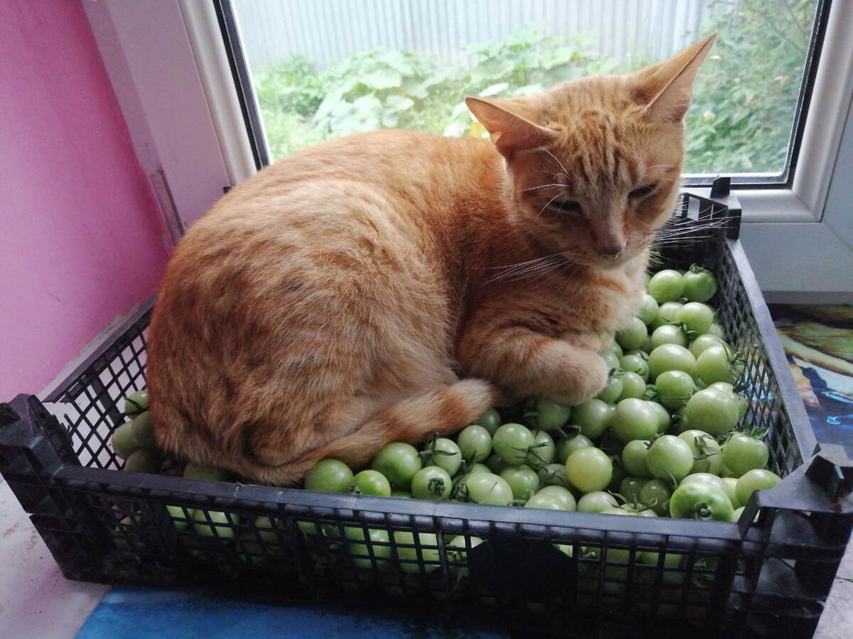 Я рыжий кот, и зовут меня Кот. Намедни мои люди поставили на наш, облюбованный котами, подоконник ящик. Отличный, удобный ящик. Я сразу на него глаз положил. Только в ящике были те странные ягоды, что люди называют "помидорами". Люди их едят, когда они перестают быть зелеными. А по мне - гадость редкостная, я такое в рот не возьму. Но ящик мне так понравился, что решил я попробовать, может, эти зеленые ягоды как матрас могут послужить? Осторожно, аккуратно, я лег на них. И знаете что? Это оказалось очень удобно! Люди, правда, как-то странно отреагировали. Сначала поругать хотели меня непонятно за что. Ведь сами же мне в ящик вместо удобного матраса положили ягоды! А потом смеяться стали, говорили что я "помидоры высиживаю"! Я не понял. Потому не обиделся. Выгонять, вроде, не стали. А вот на следующий день, после прогулки по моим владениям, прихожу, а в коробке уже нет моих насиженных, удобненьких "помидорок". Вместо них лежит подстилка. Мягкая, тряпочная. Но это же не мои "помидорки"!