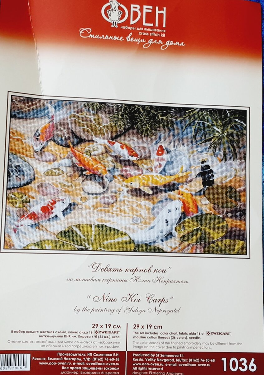 Всем привет, дорогие читатели! Знаете, мне стыдно, что эту статью я начала писать еще прошлым летом, т.к. думала, что закончу вышивку часов-пиццы и начну вышивать новую работу, однако только сделала подготовку. Это набор от новгородской фирмы "Овен " под названием "Девять карпов кои". Согласно символике, девять карпов кои привлекают материальное благополучие и процветание. Мне набор подарила сестра по моему заказу:). Канва в наборе номер 16, довольно-таки мелкая, чтобы к такой привыкнуть, я поначалу вышиваю всего минут по 20 в день, иначе глаза устают. Нитки хлопково-акриловые, 32 цвета, их я намотала на самодельные картонные бобинки. Специально для таких случаев собираю коробки из-под сахара, чая и кукурузных хлопьев. Есть в вышивке ещё несколько смешанных оттенков из двух ниток, которые нужно будет вышивать вместе. Для них приготовила тоже отдельные картонки. Сами по себе нитки довольно длинные и мне удобнее складывать одну нить пополам, чтобы она не путалась и не закручивалась.