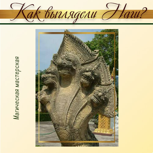 Как выглядели Наги? Наги имели одну или несколько (две, три, пять, семь и т.д.) человеческих голов без волос и туловище с расширенной шеей очковой змеи (кобры) с одной парой ног или совсем без ног. Наги были окрашены в голубой, зеленый, красный, черный и белый цвета и носили разнообразные одежды. Например, Шеша изображался в пурпурном одеянии с белым ожерельем вокруг шеи, сестра Васуки, безупречно сложенная Джараткара, - облаченной в красивую одежду и украшенной драгоценностями. "[Наги]из рода Васуки... были голубого, красного и белого цветов: все они обладали огромными, отвратительного вида туловищами, переполненными смертельным ядом. Их имена - Котика, Манаса, Пурна… [Наги] из семейства Дхритараштры. Эти змеи… могли передвигаться с быстротой ветра и были ужасно ядовиты. Вот они - Шанкукарна, Пингалака, Кутхарамукха…" (Махабхарата) Пятиголовый царственный нага. Храм Ват Пхра Каю, Бангкок, Таиланд На фресках Сигирии, которую некоторые исследователи сопоставляют с Ланкой из "Рамаяны" ,