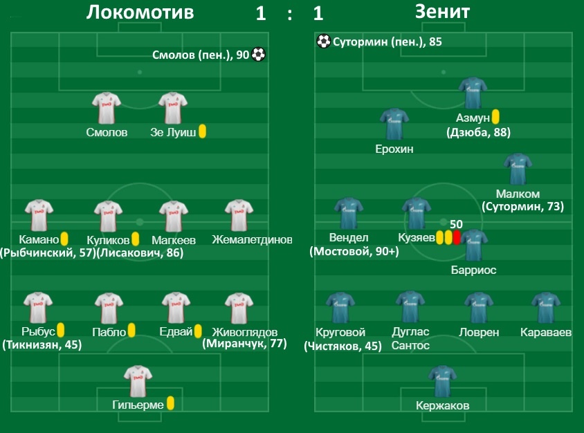 "Локомотив" вышел играть в 4-4-2, отказавшись от ромба. Камано и Жемалетдинов заняли фланги и встречали соперников вместе со Смоловым и Зе Луишем, опускавшимися достаточно глубоко. Живоглядов и Рыбус, если атака "Зенита" была не позиционная, выходили и встречали фланговых защитников "Зенита" - смелое решение, но применялось оно не часто. Показателен момент с перехватом мяча Тимом Едваем. Новичок "Локо" сыграл на опережение и понёсся в атаку, а его партнёр отдал мяч назад, а не на ход хорвату. Осторожность - наше всё. Недаром РПЛ зовут "лигой автобусов". "Зенит" использовал более сложные тактические построения, которые отчасти видны на схеме ниже. Номинально Питер играл в 4-4-2, но Ерохин с позиции форварда уходил вглубь, Малком, наоборот, играл в позиции флангового нападающего. Если Вендел уходил в центр, схема могла напоминать 4-3-3. В позиционной атаке "Зенит" растягивал линию обороны "Локо". В линии атаки оказывались Азмун, Ерохин, Круговой, Вендел, Малком. Но попытки запутать обор