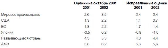 В ноябре МВФ опубликовал пессимистический прогноз, внеся изменения в свои предыдущие оценки мирового экономического роста (см. табл. 1). В декабре еще раз были сделаны негативные поправки. В том числе для России темп роста ВВП на 2002 год снижен с 4,2 % до 3,6 %.
