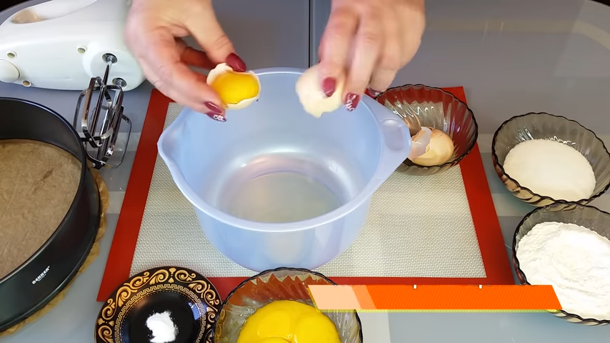 В миску для бисквитного теста, отделяем белки от 3-х яиц, желтки пока откладываем в сторону.