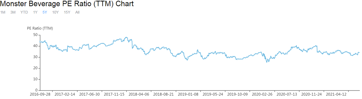 Сектор – потребительный (защитный) Индустрия - напитки-неалкогольные (3 место по капитализации) Мультипликаторы: Cash-TO-Debt = отсутствует (так как долга нет) Операционная прибыль (прибыль от основной деятельности) % = 34,98% Чистая прибыль (прибыль/выручку) % = 29,88% ROE (прибыль/собственный капитал) = 30,31%, т.е. рентабельность собственных активов ROA (прибыль+процентные платежи/капитал) = 25,05% рентабельность всех активов · Средний рост выручки за 3 года: 13,8% · Средний рост прибыли за 3 года: 13,6% · Средний рост EPS (прибыли на акцию) за 3 года: 23% Что касается среднего P/E по индустрии, равного – 26,44, то он меньше, чем у компании: 34,19. Средний P/E для компании – в районе 30 годовых прибылей. Финансовые показатели 2017-2021: Рост выручки почти в 1,7 раза Рост прибыли (EBITDA) в 1,5 раза Рост прибыли на акцию (EPS) в 2 раза Рост активов в 1,4 раза (в основном за счет своих средств) Прогнозные финансовые показатели 2021-2023: Последовательный рост на 10-12% годовых. Инса