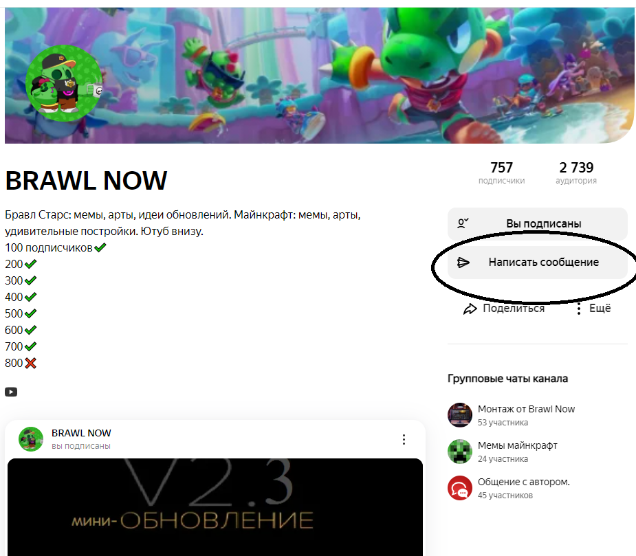 Всем привет снова, и я создал новый чат! Он не отобразится на канале, т.к. он секретный. Туда могут попасть только Дзенеры, но не так всё просто... Короче, подписывайтесь, ставьте лайк и погнали! Во первых, для того чтобы попасть в этот чат вам нужно быть Дзенером. Казалось бы всё очень просто (если вы уже зарегистрировали аккаунт), но нет, ВАМ НУЖНО НАБРАТЬ 50 ПОДПИСЧИКОВ! Тех кого я знаю, уже автоматом попали в этот чат! Ну а те кто не попали у вас есть 2 причины. Либо как вы уже поняли выше вы не дзенер, либо у вас нету 50 подписчиков! Если вы это читаете и не знакомы со мной, то просто напишите мне в личку, я каждый день заглядываю в мессенджер, написать мне можно через вот эту кнопку: Всё очень просто, вы пишите что вы набрали 50 подписчиков, я смотрю ваш канал и добавляю! Либо пишите что вы создали канал, и оставляете ссылку на него. Я отвечаю каждому (если вы не хейтер). Ах да, намечается коллаборация с одним Дзенером по майнкрафту, должна выйти на этой неделе. Гадайте кто это