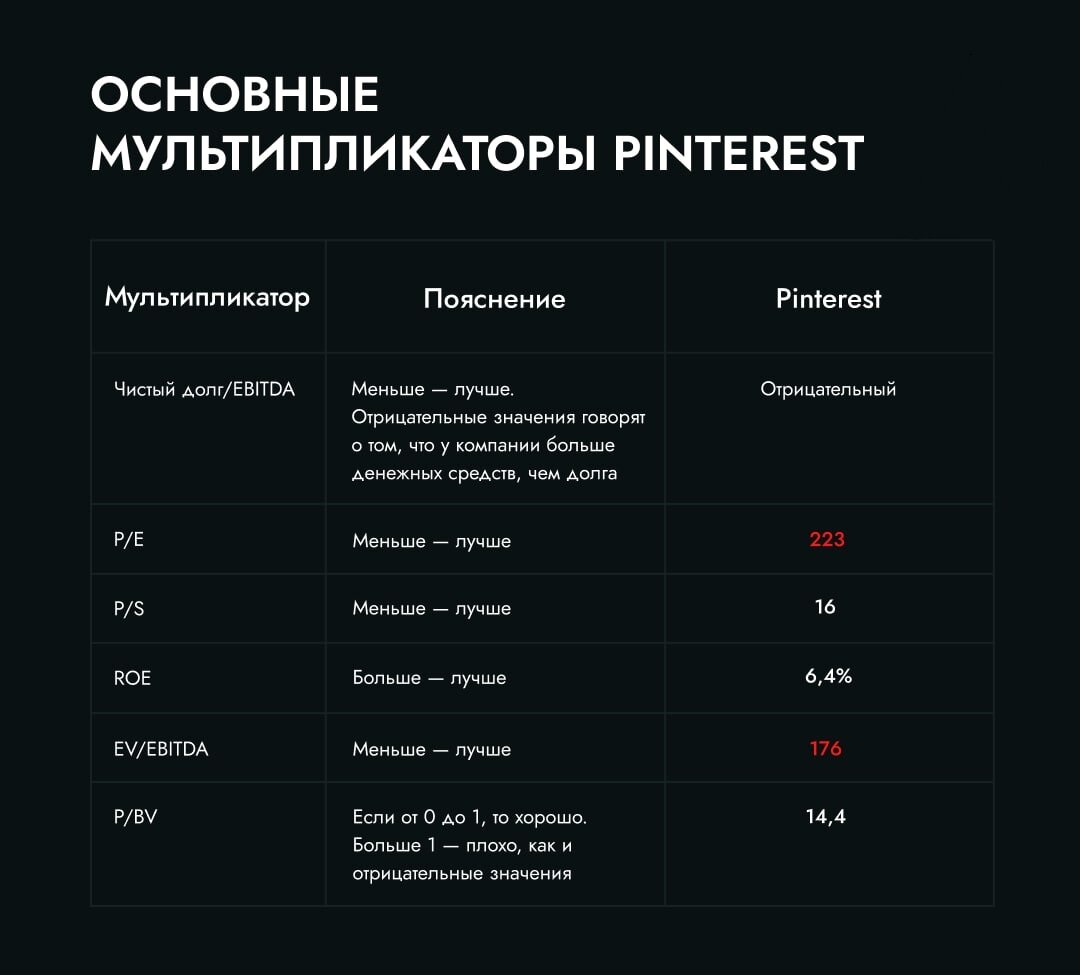 На прошлой неделе писал про сделки фонда Кэти Вуд и упомянул Pinterest, социальную сеть по обмену фотографиями. Сегодня разбираю эту компанию, за неё проголосовало большинство. На чём и сколько зарабатывает компания Основной источник доходов — реклама. В Pinterest полно онлайн-магазинов, которые продвигают свои товары за счёт красивых фото. Эта модель бизнеса позволяет компании наращивать выручку. Например, с 2017 по июнь 2021 она выросла на 376% ($0,47 млрд → $2,2 млрд). С прибылью дела обстоят хуже. По факту Pinterest работает себе в минус: 1. В 2017 убыток составил $0,13 млрд 2. В 2018 — $0,62 млрд 3. В 2019 — $1,3 млрд 4. В 2020 — $0,12 млрд Откуда такие убытки. Компания тратится на маркетинг и исследования рынка. Кроме того, часть доходов «съедают» обслуживание хостингов, мобильного приложения, зарплаты сотрудникам. Лишь в 2021 Pinterest показала чистую прибыль в $161 млн. Пандемия и рост интереса к онлайн-сервисам сыграли свою роль. На это указывает то, что за 2020
