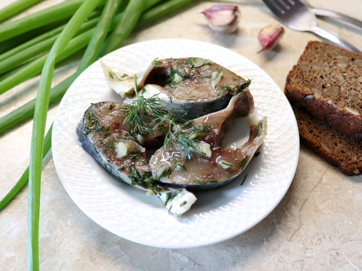 Сельдь домашней засолки можно солить не только с луком, но и с чесноком. Получится совсем не хуже. Рыбка приобретает пикантный вкус и прекрасно сочетается с отварной картошкой с зеленью. Если любите экспериментировать на кухне - обязательно попробуйте! Ккал: 154.59, время приготовления: 900-1200 мин., порций: 4 #Салаты и закуски #Русская #Блюда из рыбы #Закуска #Просто приготовить Ингредиенты Приготовление: 1. Подготовить необходимые ингредиенты для закуски. Свежемороженную сельдь разморозить, выпотрошить, хорошо помыть. Чеснок почистить, укроп сполоснуть водой и промокнуть от влаги. 2. Рыбу нарезать кусочками, толщиной 2-2,5 сантиметра. В тарелке смешать соль, сахар и черный перец. 3. Кусочки рыбы посыпать посолочной смесью и перемешать, чтобы она равномерно распределилась по кусочкам. 4. Чеснок нарезать пластинками, укроп мелко нарубить. Посыпать ими кусочки сельди. 5. Хорошо перемешать и плотно уложить в удобную ёмкость. Закрыть крышкой или пищевой плёнкой и отправить в холодиль