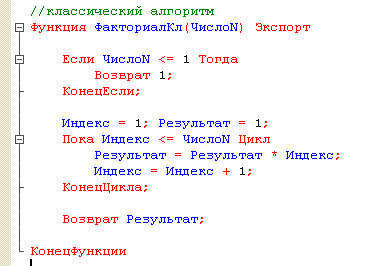 Всем привет! Начнем с классического варианта алгоритма: Есть еще вариант алгоритма на рекурсии: Забегу вперед, и напишу, что расчет 50 000! классическим алгоритмом занял 22 сек. против 1,6 сек реализации на Cи Шарп (смотрите публикацию на Хабр Алгоритмы быстрого вычисления факториала). Реализация на 1С рекурсии вылетает из 1С даже для 2000! Интересные обсуждения на эту тему есть под публикацией 2014 года Библиотека математических функций 1.1 Я подумал, что в жизни, наверное, нет задач, в которых надо рассчитать факториал единожды. Подумал, что чаще встречаются задачи, в которых факториал считается для некой последовательности чисел или для разных вариаций (сценариев) - по сути несколько раз. Также подумал, что можно использовать в некотором смысле машинное обучение: если рассчитать факториал для 10 000, запомнить результат, то при расчете факториала для 10 001 не придется заново умножать с 1 ... до 10 001, а воспользуемся формулой 10 000! * 10 001. Для такой оптимизации я добавил в алг