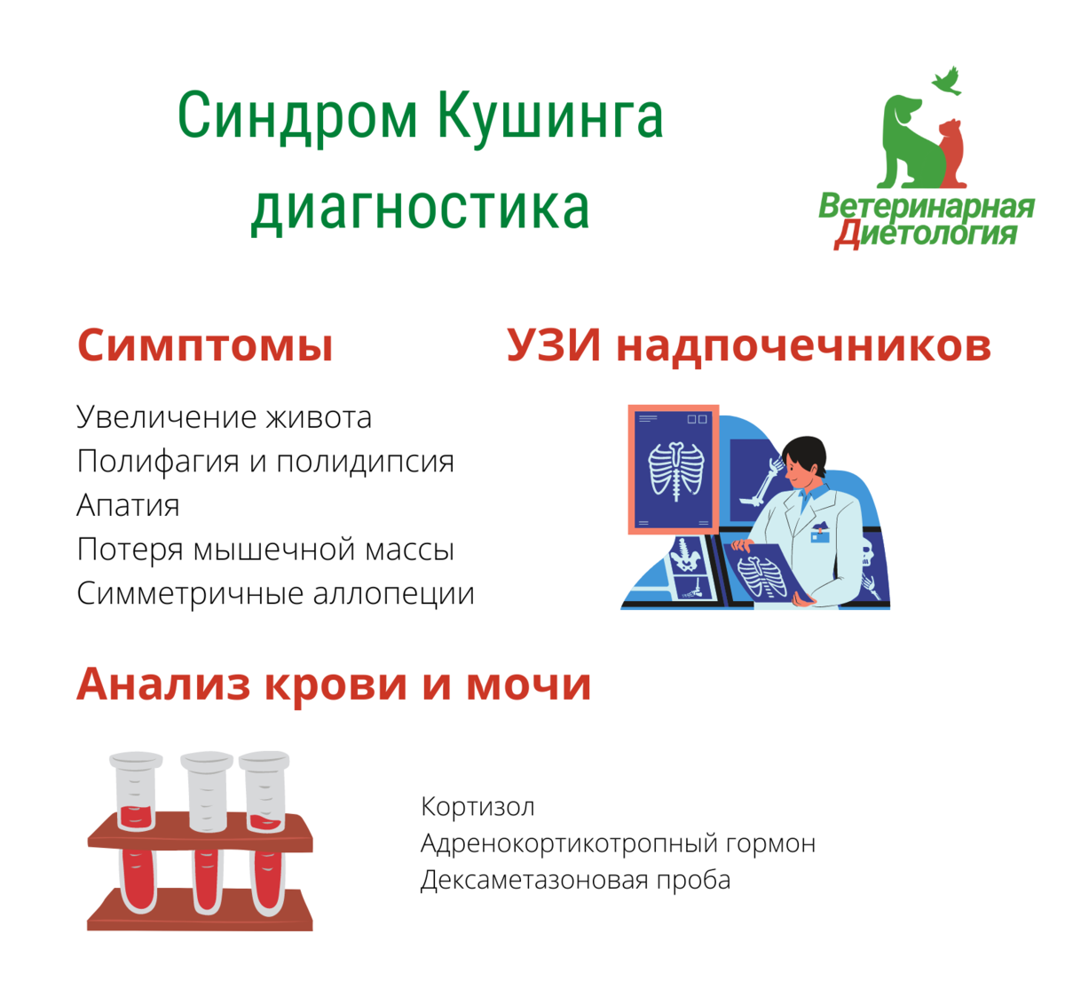 Клинические признаки болезни Кушинга у собак включают полиурия, полидипсия, полифагия, увеличение веса, увеличение «провисание» живота, вялость, одышка и дерматологические заболевания (алопеция, дерматиты и др).