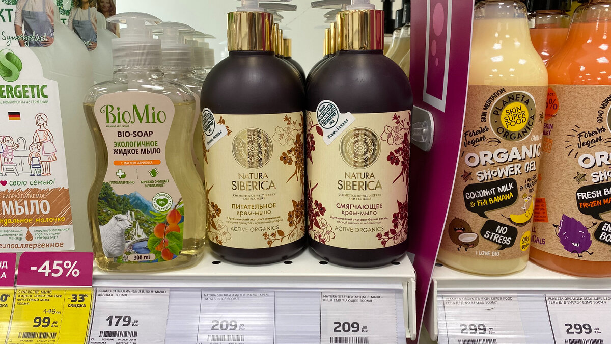 Привет! Хочу поделиться с вами несколькими товарами, которые я впервые увидела на полках Магнит Косметика. Начнем, пожалуй, вот с такого крем-мыла от Natura Siberica. В магазине было два вида: питательное и смягчающее. Питательное крем-мыло содержит органический экстракт женьшеня, вечернюю примулу и мускатный шалфей. Оно мягко и бережно очищает, смягчает и поддерживает естественный баланс кожи. Также это мыло питает кожу рук, повышая тонус и элестичность. В состав смягчающего крем-мыла входят органический экстракт белой сосны, лесной жасмин и зеленый чай. Оно мягко и бережно очищает, смягчает и поддерживает естественный баланс кожи. Также это мыло предотвращает появление сухости и трещин. Еще я увидела вот такие пасты для зубов от фирмы Synergetic. Всего в магазине было 4 разных вида. Вот такую пасту с кокосом и мятой я взяла на пробу, она нам понравилась. Здесь нет фтора, что очень важно для здоровья зубов. Еще в магазине была вот такая паста с малиной и мятой. И вот две другие пасты.