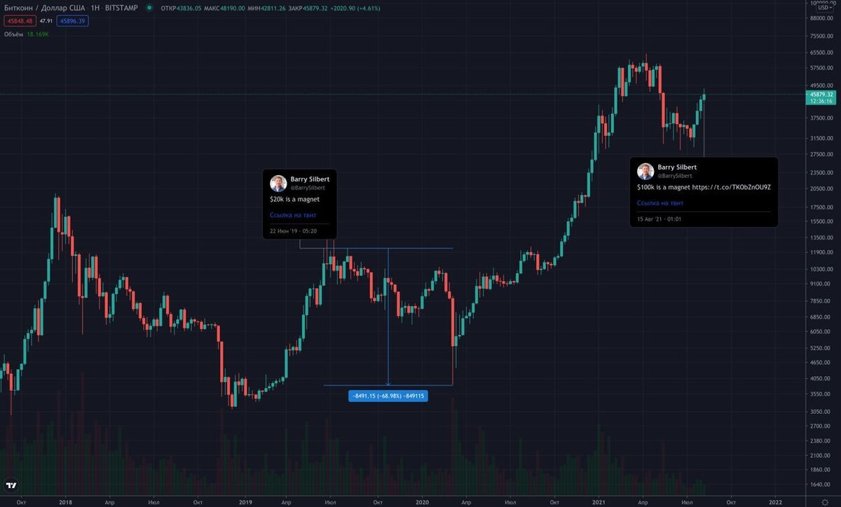 Основатель Digital Currency Group, материнской компании Grayscale, Барри Силберт поделился своим мнением о будущей стоимости BTC. Силберт предположил, что $100 000 является «магнитом» для биткоина. Он отметил свой похожий твит от 22 июня 2019 года, когда написал то же самое об уровне в $20 000. Правда после его твита в 2019 году, курс BTC в последующие 8 месяцев обрушился на 70% и прогноз сбылся только в декабре 2020 года.