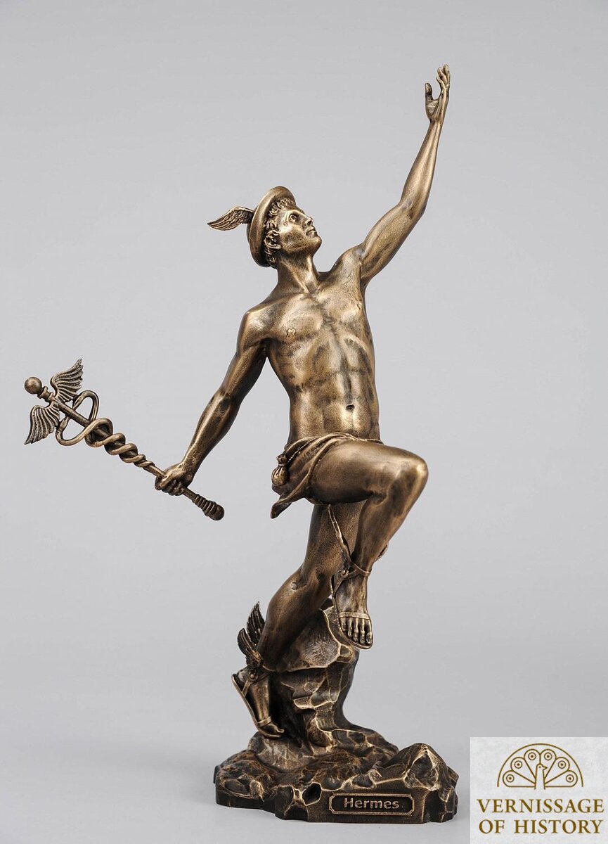 В древнегреческой мифологии эта фигура занимается место Бога, покровительствующего торговле, воровству и красноречию. Гермес почитался глашатаями, послами и пастухами и многими другими. Будучи сыном Зевса, он прославился ещё в младенчестве, тем, что смог украсть коров у самого Аполлона и остаться безнаказанным даже после того, как Аполлон при Зевсе уличил его в краже. Также, во многих источников древнегреческих мифов не раз упоминается, что Гермес исполнял роль Психопомпа - проводника усопших душ в последний путь, а именно - Царство Аида. Гермес был не раз становился объектом творчества таких непревзойдённых мастеров западноевропейского искусства как Рафаэль, П. П. Рубенс и др. А помните уморительного и манерного гонца в диснеевском мультфильме "Геркулес" 1997-го года? Да, это был никто иной, как Гермес.