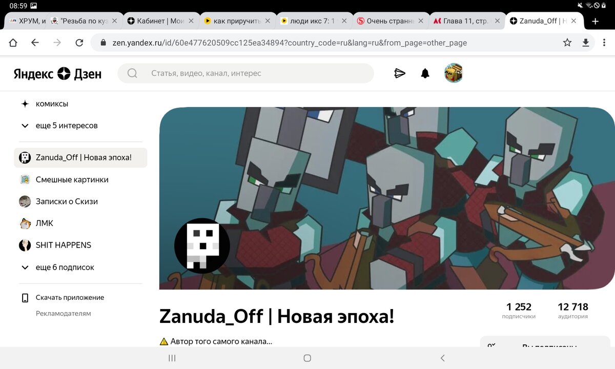 ЗАНУДА ОФФ/ОН Это Канал по Майнкрафту/Террарии/Майнкрафт данженс на котором выходят интересные статьи на разные темы. Интересные факты: Автор канала однажды испугался летучей мыши, Первый канал зануды был Забанен, или типо того. ЛМК Любитель Милых Комиксов. Название говорит всё. ЗАПИСКИ О СКИЗИ Этот канал Расказывает о жизни котика Скизи. Я начал читать канал, потомучто там есть очень интиресная история про ведьму... ну спойлерить не буду сами прочтите:) SHIT HAPPENS Мой Партнёрский канал. Все мои статьи на которых пометка "Партнёрский Материал" сделаны с ним. Он делает обзоры на игры которые уже надоели своей Рекламой, однако есть и некоторые стоящие. В Будущем планируем снимать по Фортнайт. Факты: Мы лучшие друзья в реальной жизни. Кстати если будете смотреть его канал, не судите строго, он ведь только начинает. ЛМК: https://zen.yandex.ru/perevod_lmk?country_code=ru&lang=ru&from_page=other_page Зануда офф:https://zen.yandex.ru/id/60e477620509cc125ea34894?country_code=ru&lang=ru&from