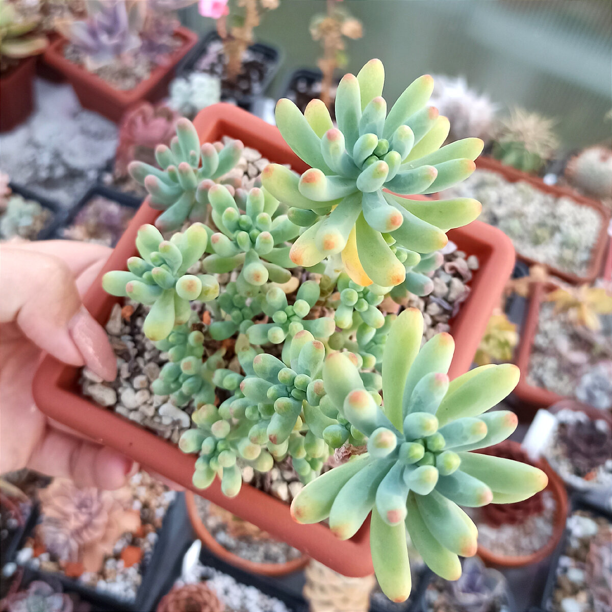 С эхевериями и седумами хорошо уживутся следующие виды крассул: рупестрис (все её разновидности, например, марнье, том тумб, хайт вольтаж и т.д.), текта, манимейкер, эрнести, мезембриатеновидная, крассула бен, крассула перфората, лангулоза, волкенси и ещё многие другие. Я бы не советовала подсаживать к эхевериям и седумам крассулу роджерси, раттраи, броуниана, т.к. эти виды более требовательны к поливу (с такой же регулярностью полива как у эхеверий, эти крассулы вянут, листики теряют тургор и выглядят не очень хорошо).
