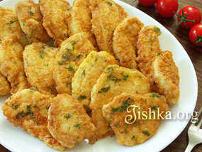 Если некоторые кусочки грудки получились в виде полосок, выкладывайте их на сковороду после панировки в сложенном виде (как на фото), и после обжарки они примут нормальную форму, никто не догадается о том, что это полоска.
